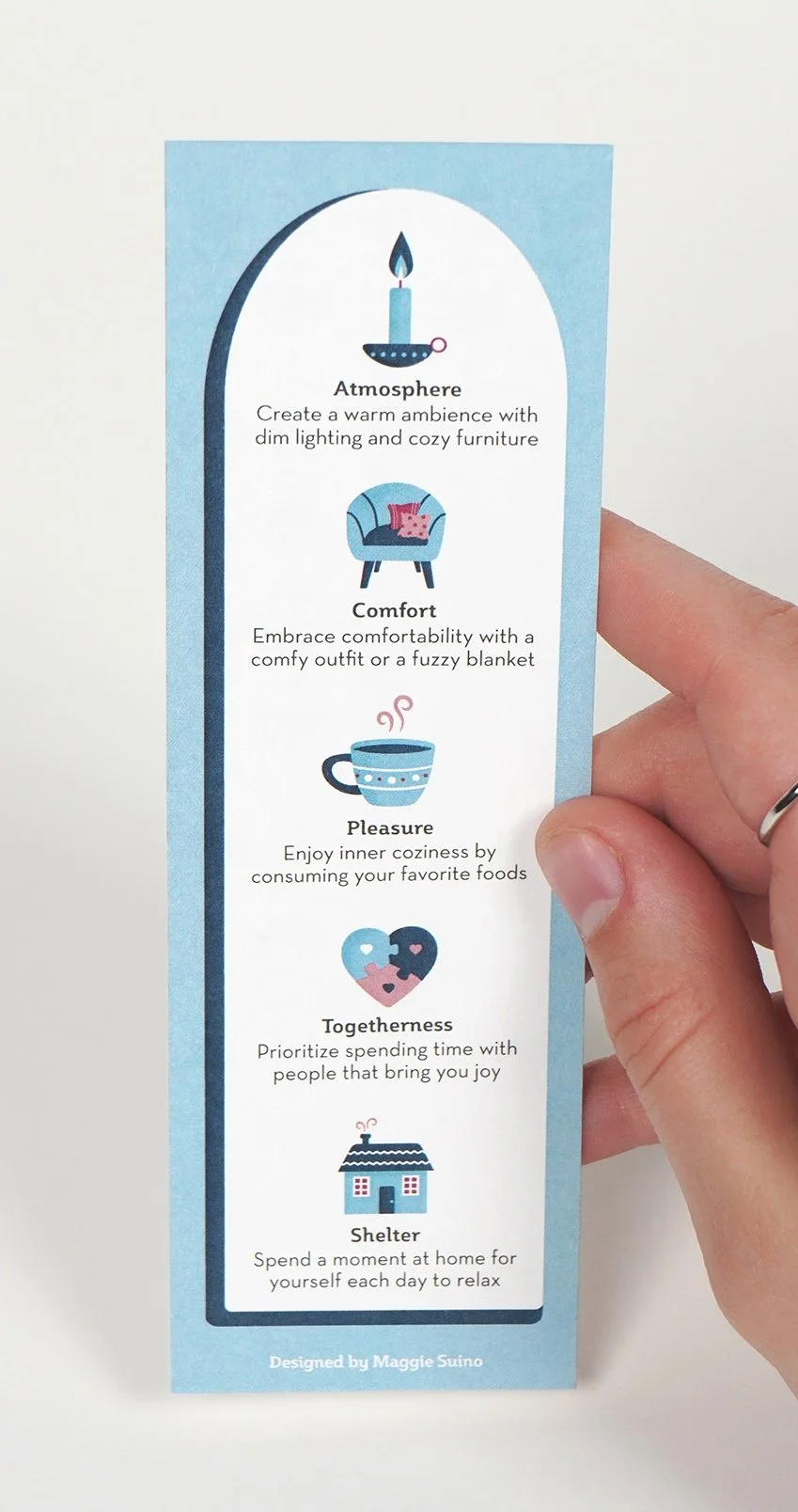 The Hygge Haven journal invites individuals to learn about the concept of hygge and discover ways they can incorporate hygge into their daily lives. The journal includes interactive prompts for multiple individuals write or draw in, as well as reflect upon. The design of the journal includes engaging illustrations and soft, muted colors that makes it inviting and appealing for all. The Hygge Haven exhibition space invites individuals to experience hygge wrapped up in a blanket and in a cozy environment while engaging with the journal.